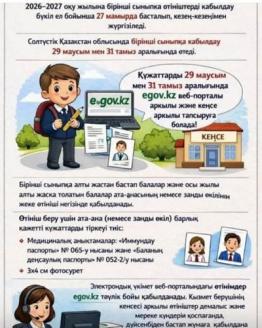 2026-2027 оқу жылына бірінші сыныпқа өтініштерді қабылдау бүкіл ел бойынша 27 мамырда басталып, кезең-кезеңімен ж...