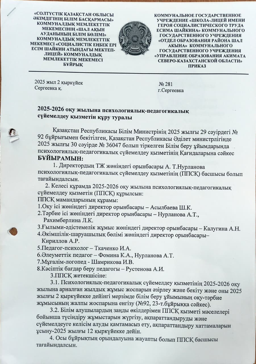 Психологиялық-педагогикалық сүйемелдеудің мектеп қызметін құру туралы