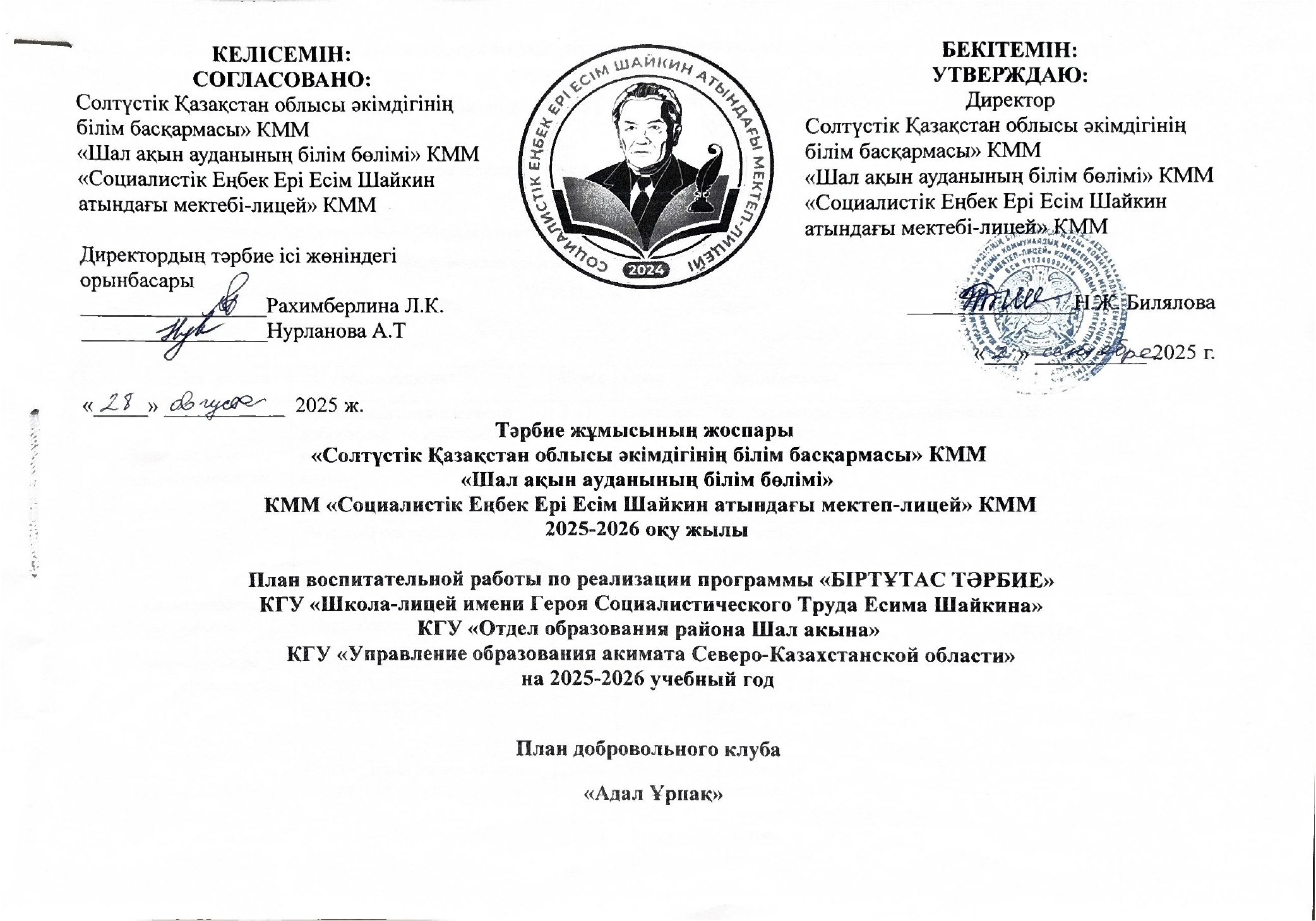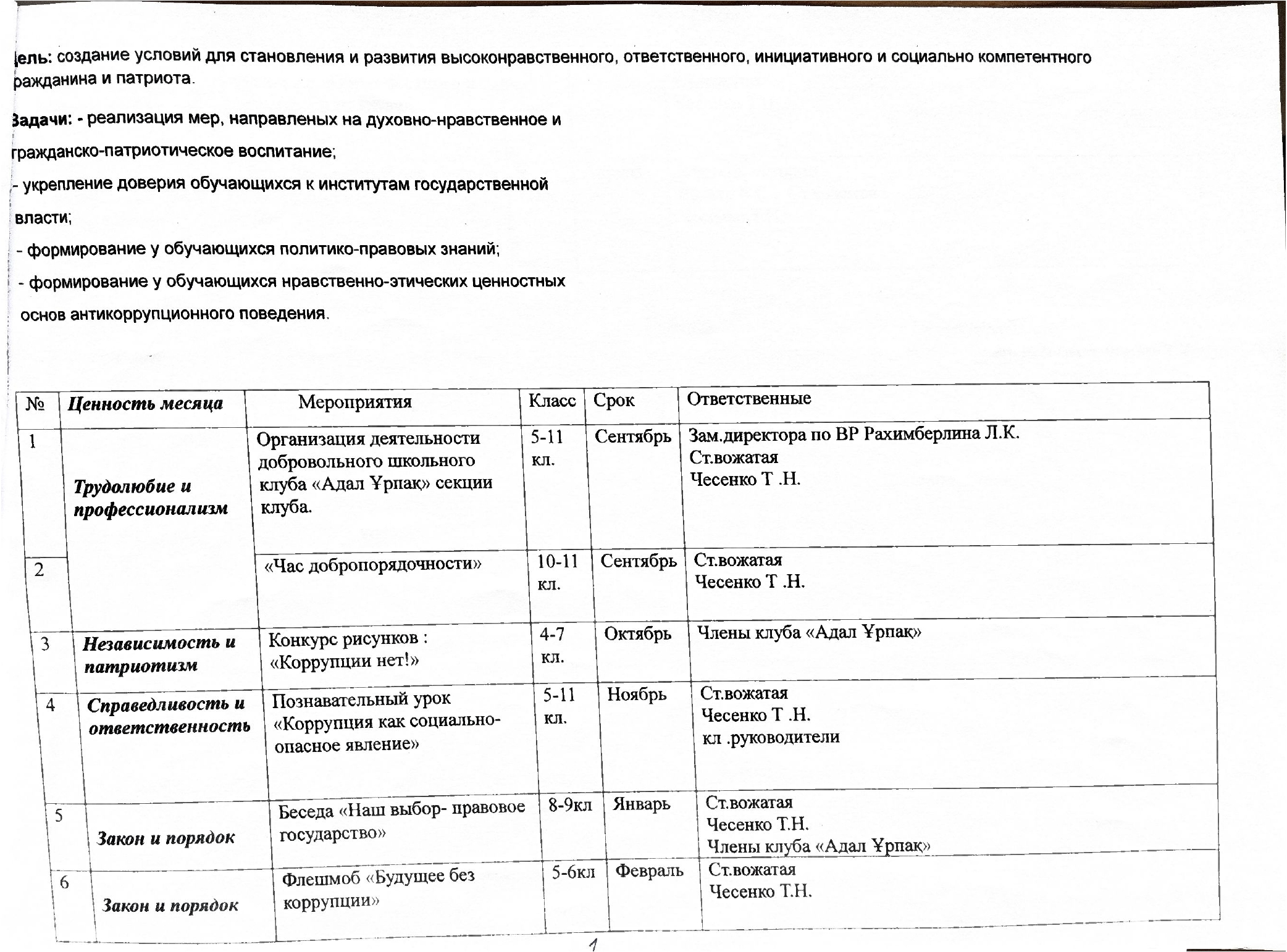 План работы добровольного школьного клуба "Адал Ұрпақ"