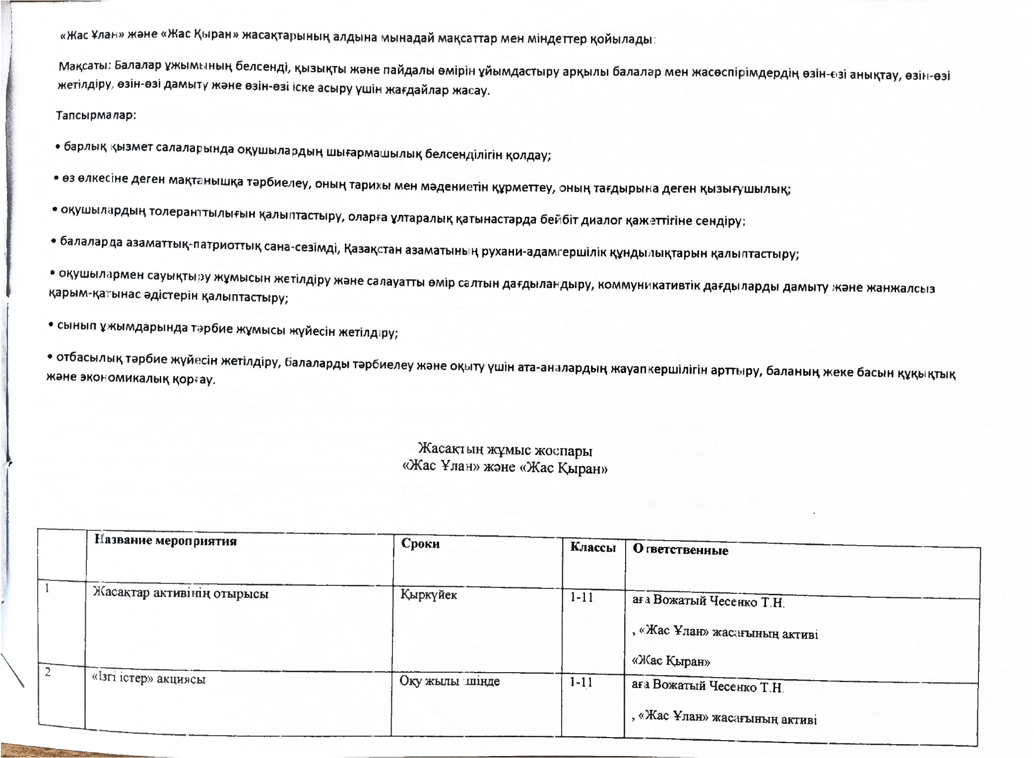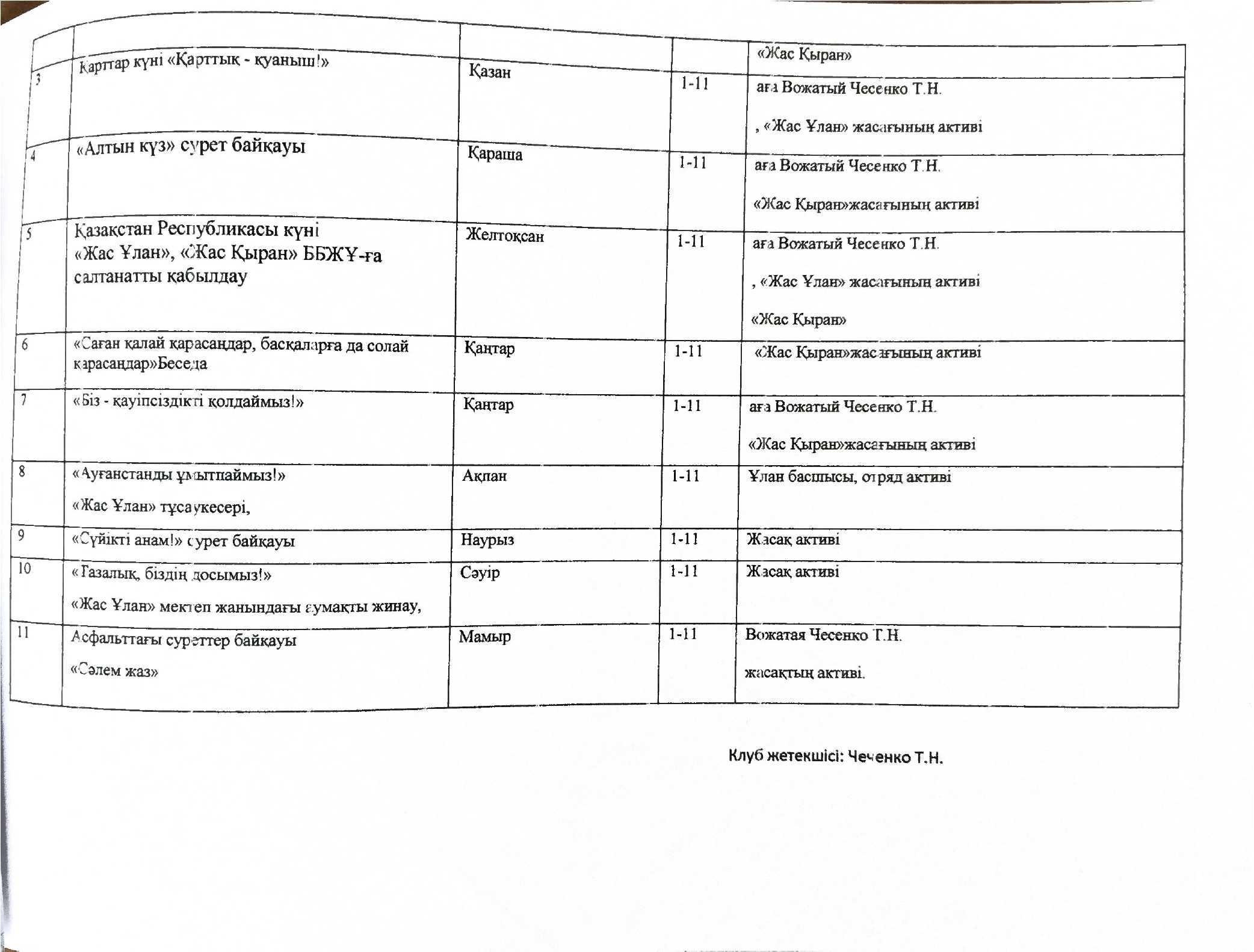 "Жасұлан", "жасқыран"ерікті мектеп клубының жұмыс жоспары