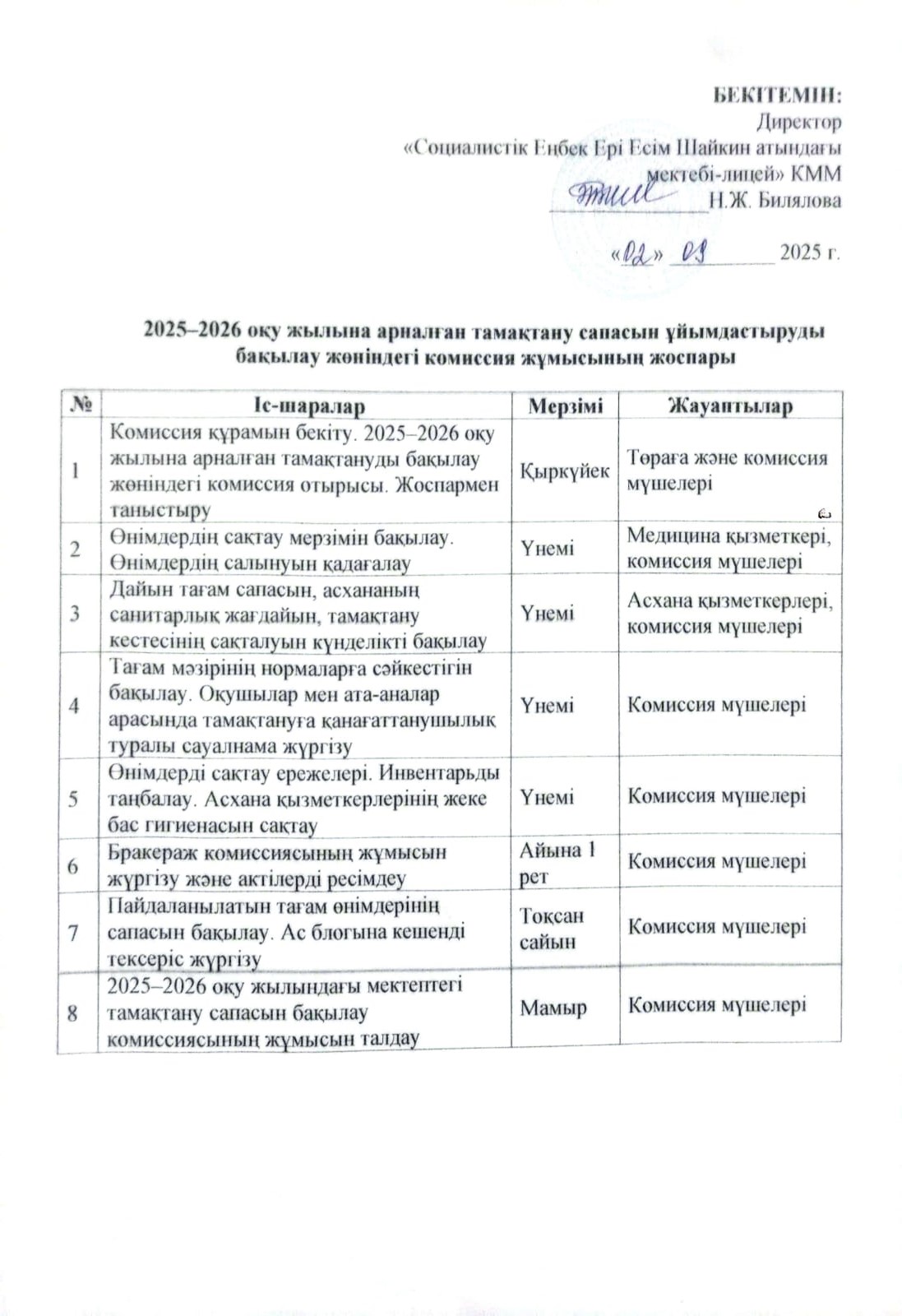 Тамақтану сапасын ұйымдастыруды бақылау жөніндегі комиссия жұмысының жоспары